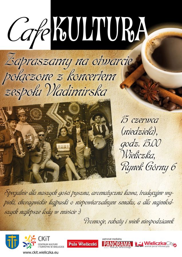 Serdecznie zapraszamy na uroczyste otwarcie CAFE KULTURA w Centrum Kultury i Turystyki w Wieliczce połączone z występem zespołu VLADIMIRSKA. Startujemy w niedzielę 15 czerwca o godz. 15.00.