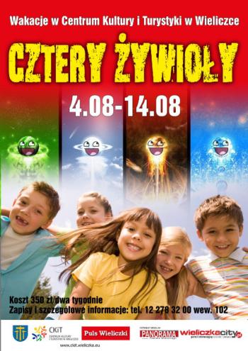 Centrum Kultury i Turystyki w Wieliczce zaprasza na ciekawe wakacje z czterema żywiołami w dniach 4 - 14 sierpnia 2014 r. Uczestnicy w trakcie dwutygodniowych warsztatów poznają czym jest ziemia, powietrze, woda i ogień. W trakcie pierwszego tygodnia pod hasłem ZIEMIA i POWIETRZE najmłodsi udadzą się na wycieczkę w głąb ziemi, wezmą udział w poszukiwaniu skarbów zgłębiając umiejętności orientacji w terenie, a także odbędą „spacer w przestworzach”. Drugi tydzień to czas odkrywania OGNIA i WODY poprzez udział w zajęciach eksperymentalnych, a także wyjazd na basen, czy rejs gondolą po Wiśle.