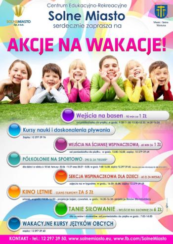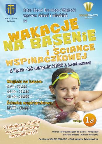 Jak co roku największym zainteresowaniem cieszyć się będzie pływalnia. W określonych godzinach dzieci będą mogły pływać oraz bawić się pod okiem animatorów, płacąc za to jedynie symboliczną złotówkę – dzięki wsparciu Burmistrza Miasta i Gminy Wieliczka Artura Kozioła. Dodatkowo w ofercie uwzględniono indywidualne i grupowe lekcje intensywnej nauki pływania.