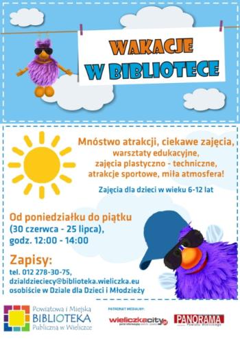 Powiatowa i Miejska Biblioteka Publiczna w Wieliczce oraz jej filie jak co roku organizują wakacyjne spotkania dla wszystkich tych, którzy swój wolny czas zechcą spędzić w naszej bibliotece. Dla naszych najmłodszych czytelników, z tej okazji przygotowaliśmy mnóstwo atrakcji
