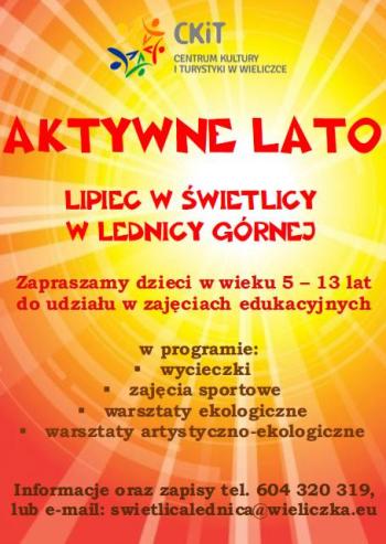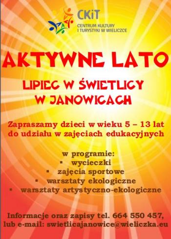 Centrum Kultury i Turystyki w Wieliczce w lipcu organizuje w Świetlicac środowiskowych w Janowicach i Lednicy Górnej BEZPŁATNE zajęcia edukacyjne dla dzieci w wieku 5 - 13 lat. W każdy poniedziałek, środę i piątek najmłodsi będą brali udział w warsztatach tematycznych i wycieczkach. W programie zajęć edukacyjnych warsztaty: ekologiczne, artystyczno-ekologiczne, fotograficzne oraz kulinarne a także zajęcia sportowe. Ponadto dzieci będą mogły sprawdzić swoją wiedzę z zakresu ekologii i przyrody w turniejach tematycznych.