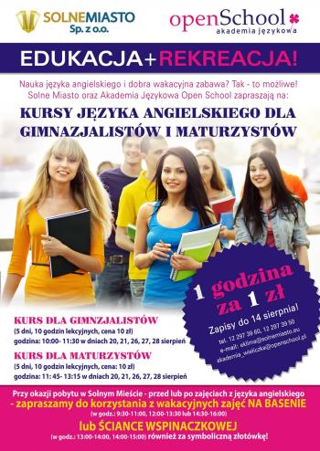 Nauka języka angielskiego i dobra wakacyjna zabawa? Tak - to możliwe! Solne Miasto oraz Akademia Językowa Open School zapraszają na: kursy języka angielskiego dla gimnazajlistów i maturzystów. Zapisy do 14 sierpnia! tel. 12 297 39 60, 12 297 39 50