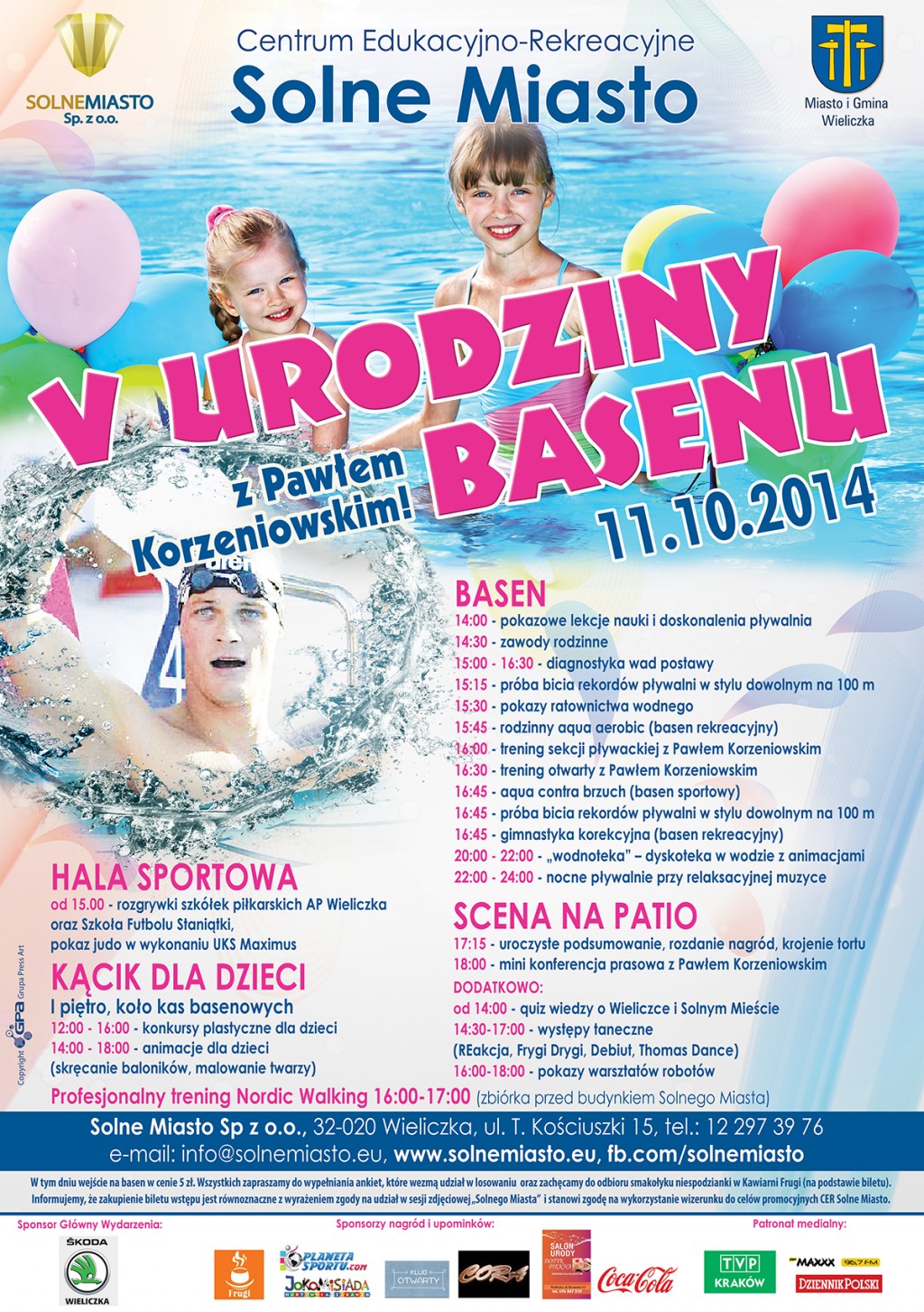 Serdecznie zapraszamy na V Urodziny Basenu z Pawłem Korzeniowskim, które odbędą się w sobotę 11 października br. w Centrum Edukacyjno-Rekreacyjnym "Solne Miasto" w Wieliczce.