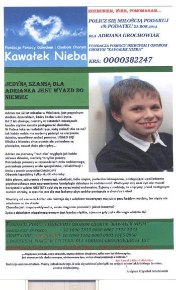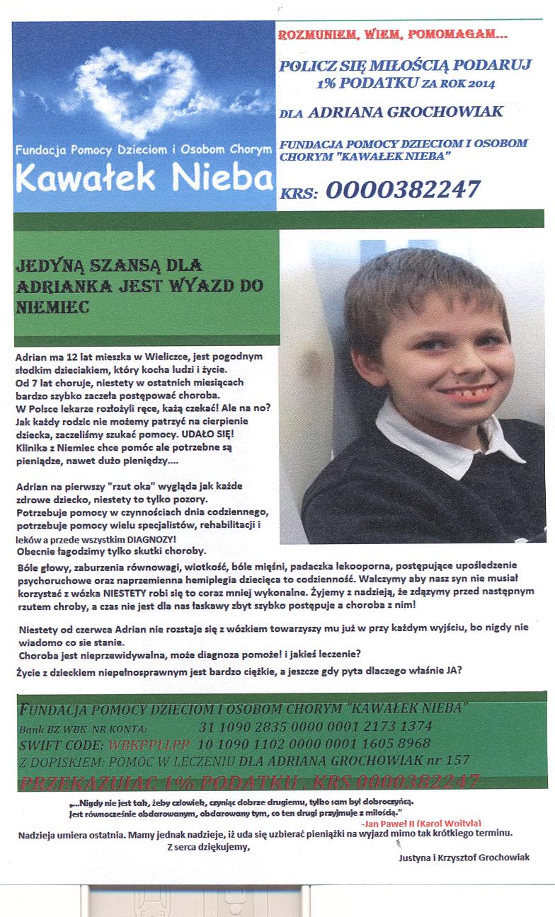 Są to cegiełki wsparcia dla 12-letniego Adriana Grochowiaka z Wieliczki. Ten pogodny chłopiec cierpi na chorobę, której polscy lekarze nie są w stanie zdiagnozować. Szansą dla Adriana jest wyjazd do kliniki w Niemczech, który jest bardzo kosztowny i nie będzie możliwy bez wsparcia finansowego dla rodziny. Prosimy o dary serca.