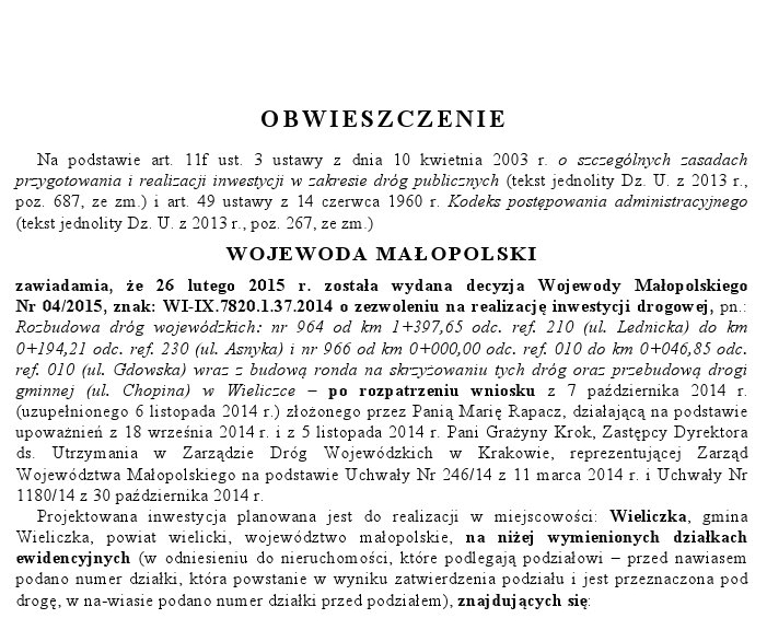 Nr 04/2015, znak: WI-IX.7820.1.37.2014 o zezwoleniu na realizację inwestycji drogowej, pn.: Rozbudowa dróg wojewódzkich: nr 964 od km 1+397,65 odc. ref. 210 (ul. Lednicka) do km 0+194,21 odc. ref. 230 (ul. Asnyka) i nr 966 od km 0+000,00 odc. ref. 010 do km 0+046,85 odc. ref. 010 (ul. Gdowska) wraz z budową ronda na skrzyżowaniu tych dróg oraz przebudową drogi gminnej (ul. Chopina) w Wieliczce – po rozpatrzeniu wniosku z 7 października 2014 r. (uzupełnionego 6 listopada 2014 r.) złożonego przez Panią Marię Rapacz, działającą na podstawie upoważnień z 18 września 2014 r. i z 5 listopada 2014 r. Pani Grażyny Krok, Zastępcy Dyrektora ds. Utrzymania w Zarządzie Dróg Wojewódzkich w Krakowie, reprezentującej Zarząd Województwa Małopolskiego na podstawie Uchwały Nr 246/14 z 11 marca 2014 r. i Uchwały Nr 1180/14 z 30 października 2014 r.