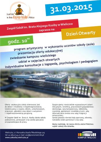 Zespół Szkół im. Brata Alojzego Kosiby w Wieliczce zaprasza dzieci wraz z rodzicami na Dzień Otwarty, który odbędzie się dnia 31 marca 2015 r. o godzinie 10:00.