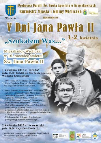 Proboszcz parafii Św. Pawła Apostoła w Krzyszkowicach oraz Burmistrz Miasta i Gminy Wieliczka zapraszają na V Dni Jana Pawła II, które odbędą się w dniach 1-2 kwietnia w Wieliczce.