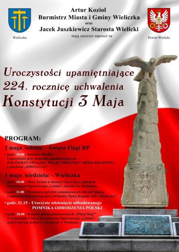 Artur Kozioł Burmistrz Miasta i Gminy Wieliczka oraz Jacek Juszkiewicz Starosta Wielicki mają zaszczyt zaprosić na Uroczystości upamiętniające 224. rocznicę uchwalenia Konstytucji 3 Maja.