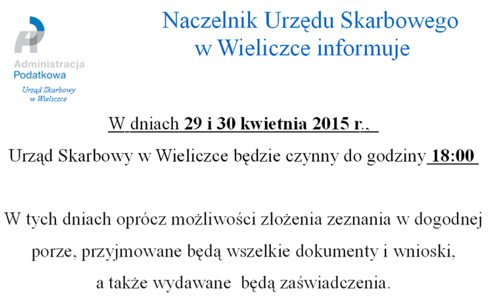 Naczelnik Urzędu Skarbowego w Wieliczce informuje podatników o wydłużonych godzinach pracy w dniach 29-30 kwietnia.