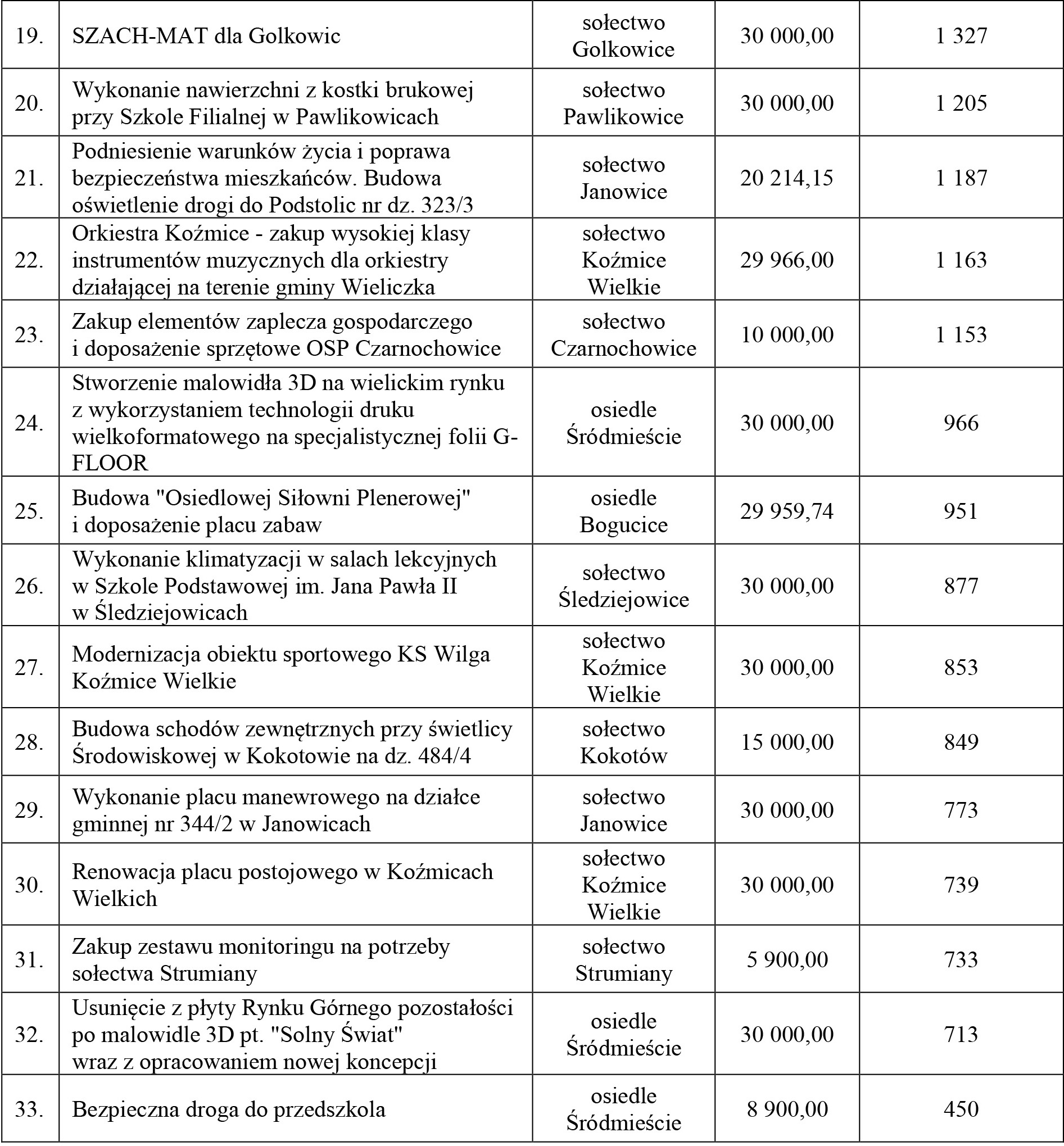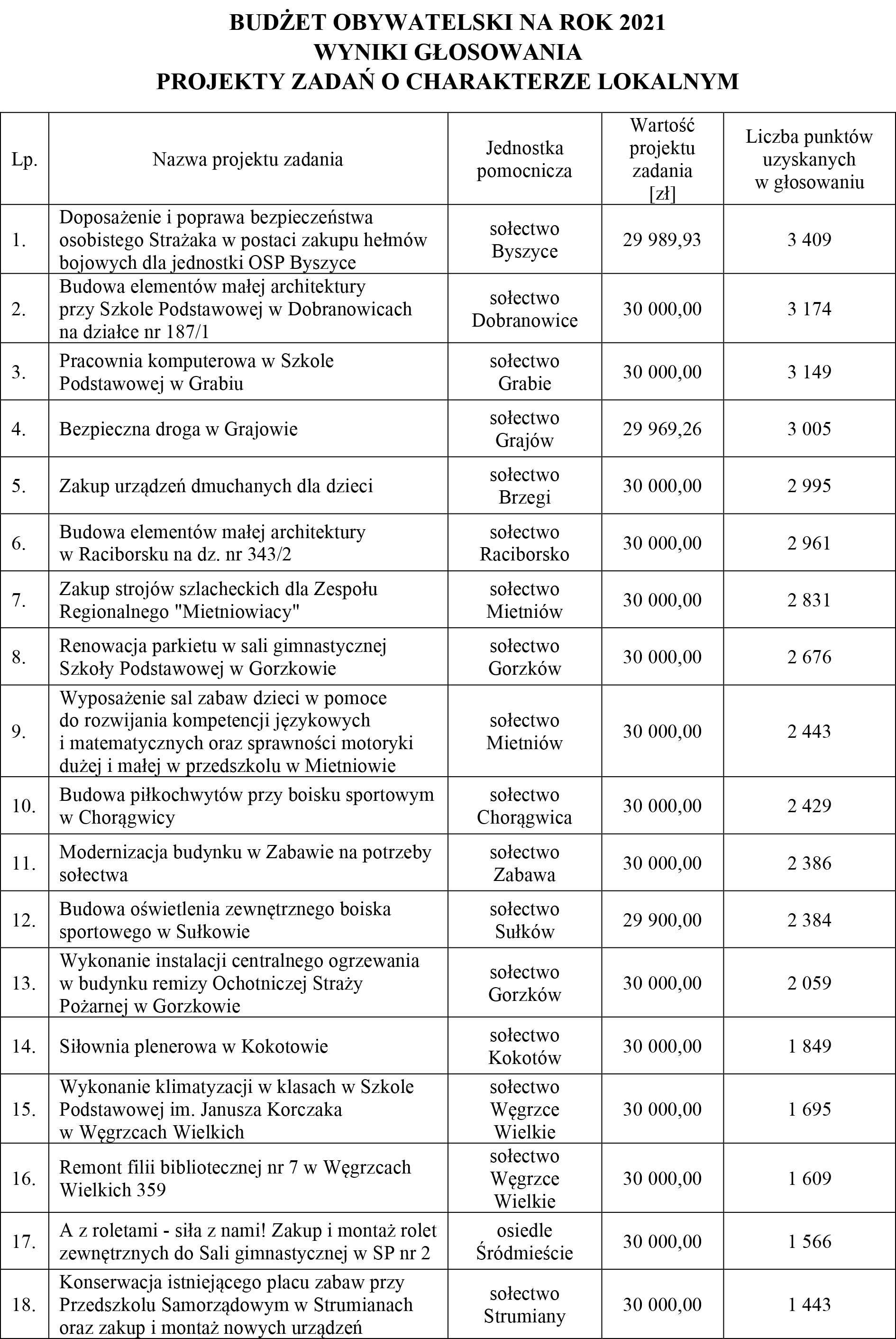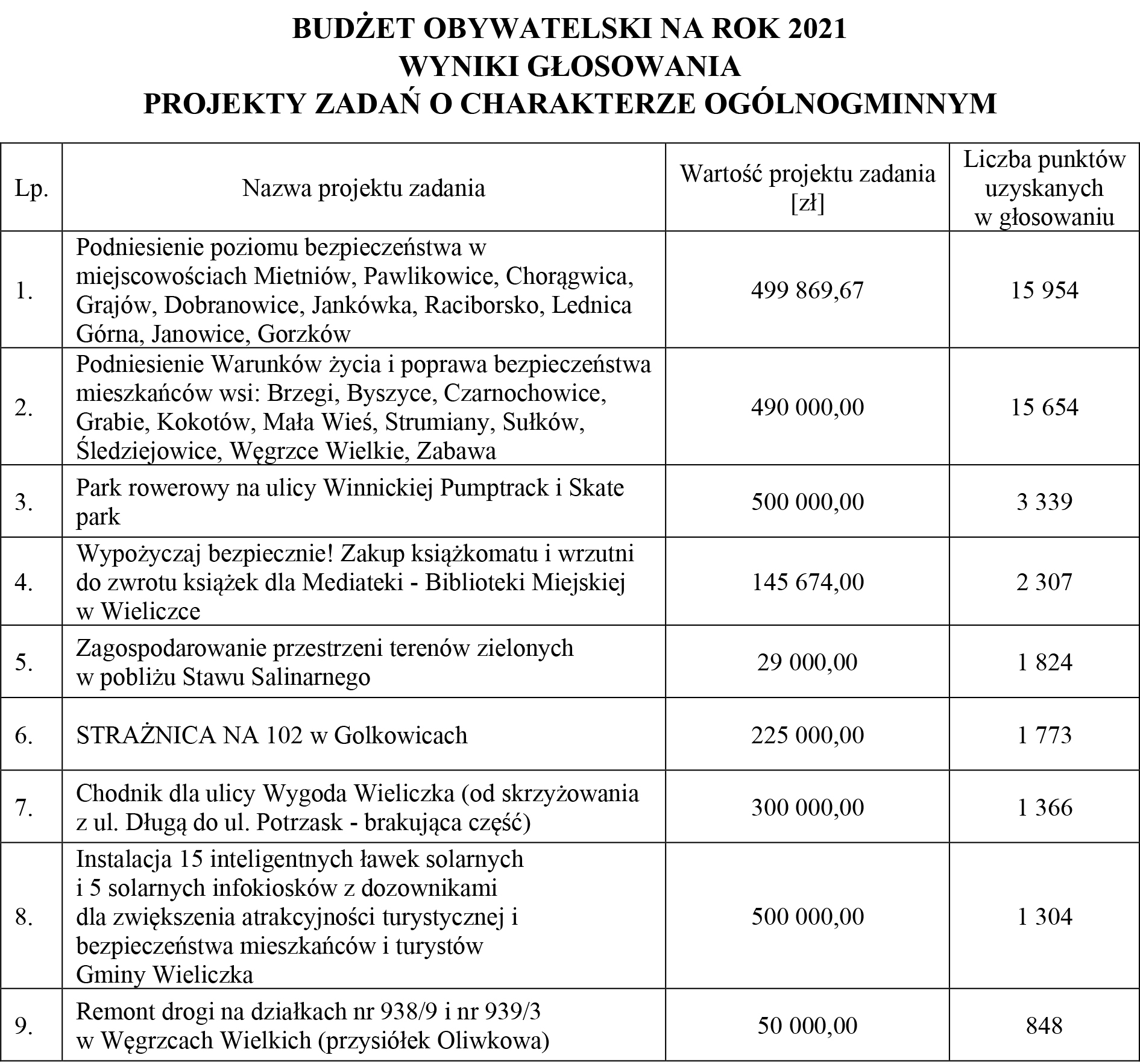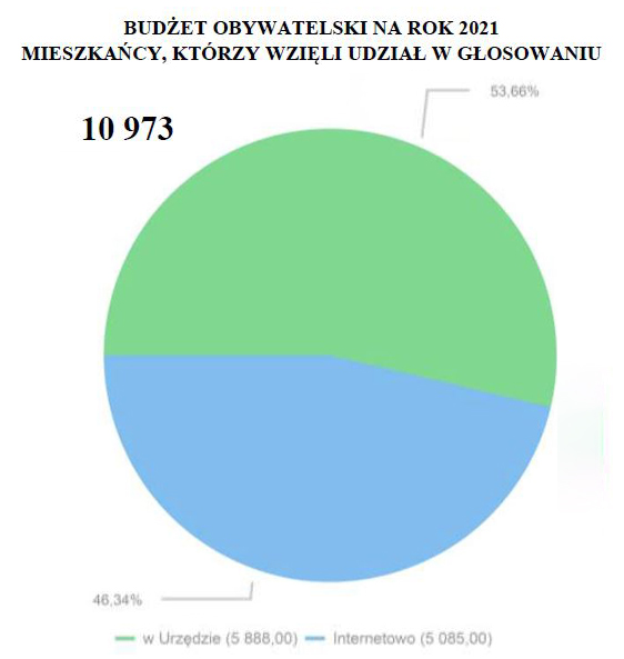 Znamy już wyniki Budżetu Obywatelskiego Gminy Wieliczka na rok 2021. Łącznie oddano 10973 głosów. W formie papierowej oddano 53,66 % głosów, a 46,34 % respondentów wypełniło ankietę online.