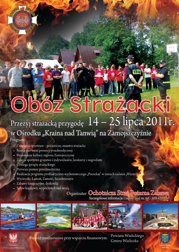 Serdecznie zapraszamy młodzież w wieku 14 - 17 lat na Obóz Strażacki, który odbędzie się w dniach 14 - 25 lipca br. Miejscem wypoczynku jest ośrodek "Kraina nad Tanwią" na Roztoczu w województwie lubelskim. Ośrodek zapewnia wysoki standard zakwaterowania i obsługi. Projekt zrealizowano przy wsparciu finansowym Gminy Wieliczka oraz Powiatu Wielickiego. Szczegółowe informacje i zapisy pod nr tel. 509-420-130.