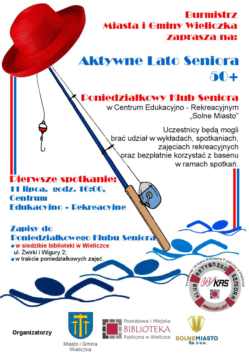 Burmistrz Miasta i Gminy Wieliczka oraz Powiatowa i Miejska Biblioteka Publiczna w Wieliczce serdecznie zapraszają na Aktywne Lato Seniora 50+. W okresie wakacyjnym odbędzie się cykl spotkań w ramach programu "Poniedziałkowy Klub Seniora". Uczestnicy będą mogli brać udział w wykładach, spotkaniach, zajęciach rekreacyjnych oraz bezpłatnie korzystać z basenu w ramach spotkań. Pierwsze spotkanie odbędzie się 11 lipca o godz. 16.00 w Centrum Edukacyjno - Rekreacyjnym w Wieliczce.