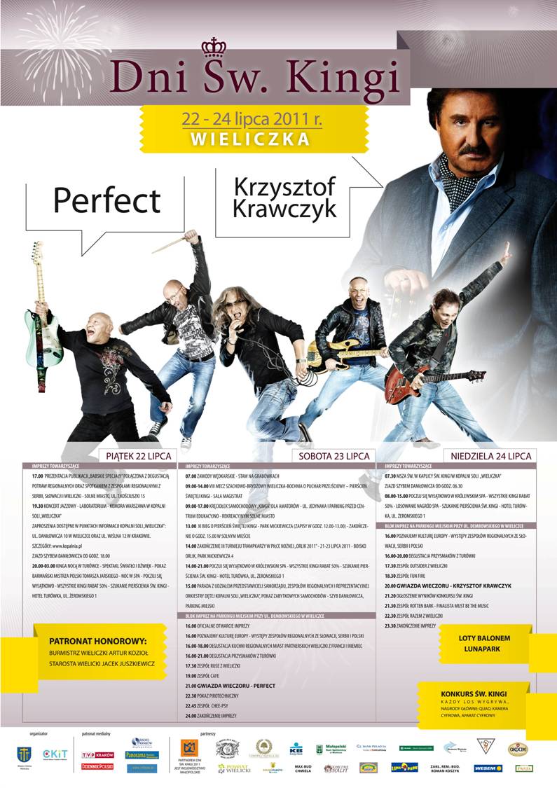 Serdecznie zapraszamy na coroczne Dni Św. Kingi, które odbędą się w dniach 22-24 lipca br. na parkingu miejskim przy ul. Dembowskiego w Wieliczce. Sobotnią gwiazdą wieczoru będzie zespół "Perfect", natomiast w niedzielę zaśpiewa dla nas Krzysztof Krawczyk. Na wszystkich uczestników zabawy czeka moc atrakcji m.in. koncerty, loty balonem, lunapark, degustacje potraw oraz konkursy z nagrodami. Podczas Dni naszego miasta organizowanych jest także mnóstwo imprez towarzyszących. Patronat honorowy nad imprezą objęli: Burmistrz Miasta i Gminy Wieliczka Artur Kozioł oraz Starosta Wielicki Jacek Juszkiewicz. Zapraszamy do zapoznania się z programem Dni Wieliczki.
