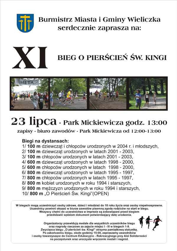 Burmistrz Miasta i Gminy Wieliczka serdecznie zaprasza na XI Bieg "O Pierścień św. Kingi", który odbędzie się w ramach odbywających się Dni św. Kingi w dniu 23 lipca w Parku Mickiewicza o godz. 13.00. Zapisy - biuro zawodów - Park Mickiewicza w godz. 12.00 - 13.00.