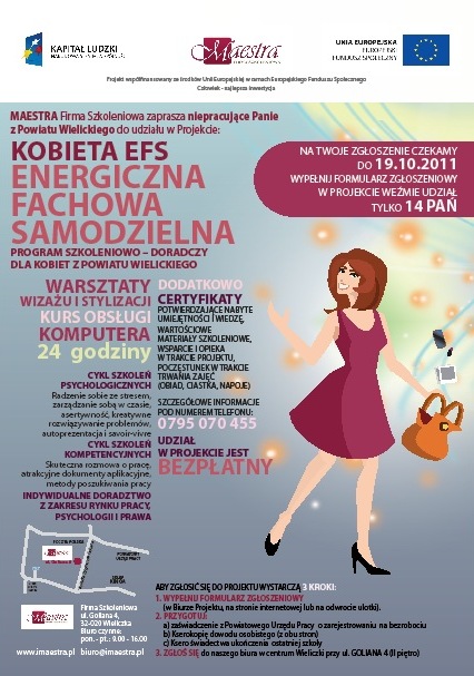 Serdecznie zapraszamy do udziału w programie szkoleniowo-doradczym dla kobiet z powiatu wielickiego pod nazwą „Kobieta EFS – Energiczna – Fachowa – Samodzielna”- realizowanego w terminie od 1 października – 31 grudnia br. Efektem szkolenia będzie rozwój potencjału uczestniczek poprzez zdobycie umiejętności społecznych takich, jak: komunikacja, asertywność, autoprezentacja czy zarządzanie emocjami i radzenie sobie ze stresem.