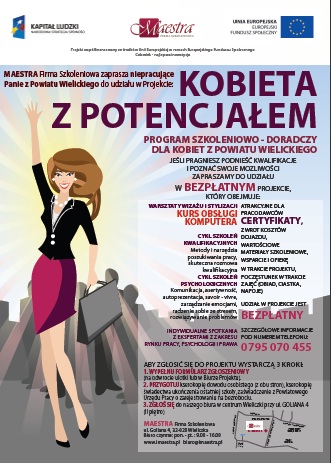 Uprzejmie informujemy, że Firma Szkoleniowa MAESTRA realizuje projekt współfinansowany ze środków Europejskiego Funduszu Społecznego: KOBIETA Z POTENCJAŁEM - Program szkoleniowo-doradczy dla Kobiet z powiatu wielickiego. Dzięki ukończeniu projektu uczestniczki zostaną zaznajomione z wiedzą i umiejętnościami z zakresu psychologii, efektywnego poszukiwania pracy, a także radzenia sobie w różnych sytuacja życiowych. Zarówno szkolenia, jak i spotkania z ekspertami sprawią, że staną się interesujące dla pracodawców i najbliższych.