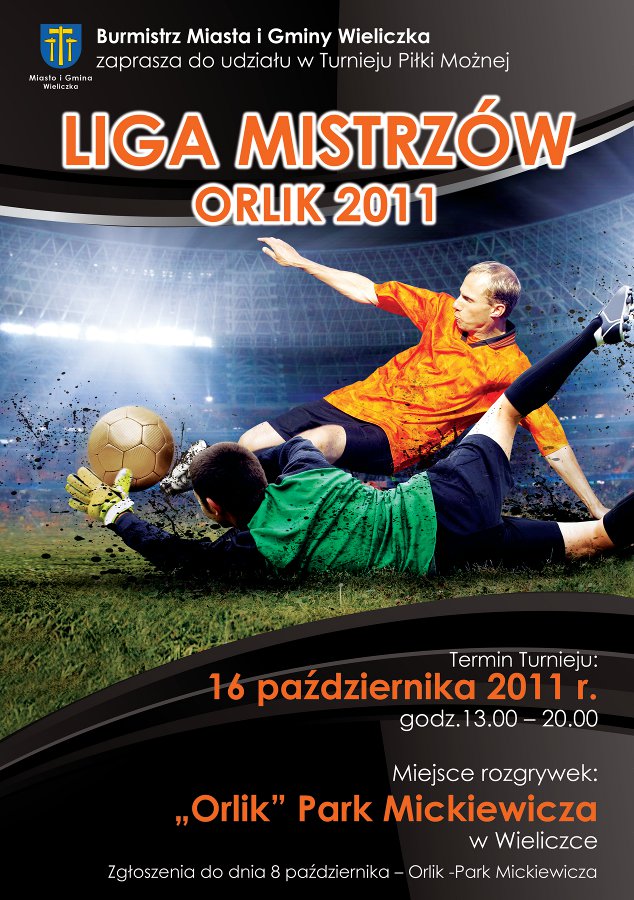 Serdecznie zapraszamy do udziału w Turnieju Piłki Nożej „Liga Miastrzów ORLIK 2011”, który odbędzie się 16 października 2011 r. w godzinach 13.00-20.00 na boisku „Orlik” w parku A. Mickiewicza w Wieliczce. Patronat nad wspomnianym wydarzeniem sportowym objął Burmistrz Miasta i Gminy Wieliczka.