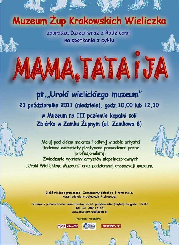 Muzeum Żup Krakowskich Wieliczka serdecznie zaprasza wszystkie dzieci wraz z rodzicami na spotkanie z cyklu Mama, Tata i Ja pt. "Uroki wielickiego muzeum". Wspólne zajęcia odbędą się w najbliższą niedzielę, 23 października br. o godz. 10.00 lub 12.30 w Muzeum na III poziomie kopalni soli. Zbiórka w Zamku Żupnym (ul. Zamkowa 8).