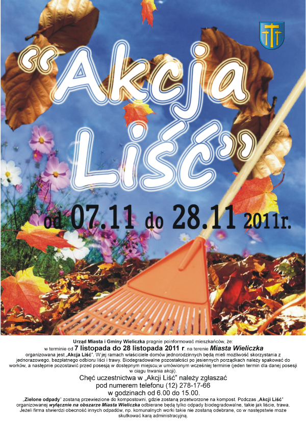 Uprzejmie informujemy, iż w dniach 7 -28 listopada 2011 r. na terenie Miasta Wieliczka organizowana jest „Akcja Liść”. W jej ramach właściciele domów jednorodzinnych będą mieli możliwość skorzystania z jednorazowego, bezpłatnego odbioru liści i trawy. Biodegradowalne pozostałości po jesiennych porządkach należy spakować do worków, a następnie pozostawić przed posesją w dostępnym miejscu, w umówionym wcześniej terminie (jeden termin dla danej posesji w ciągu trwania akcji).