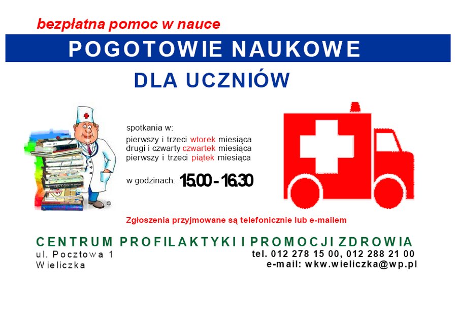 Serdecznie zapraszamy do udziału w projekcie Wielickiego Klubu Wolontariusza pod nazwą "Pogotowie naukowe dla uczniów". Spotkania będą odbywały się w Centrum Profilaktyki i Promocji Zdrowia w pierwszy i trzeci wtorek miesiąca, drugi i czwarty czwartek miesiąca, pierwszy i trzecie piątek miesiąca w godzinach 15.00-16.30. Zapraszamy!