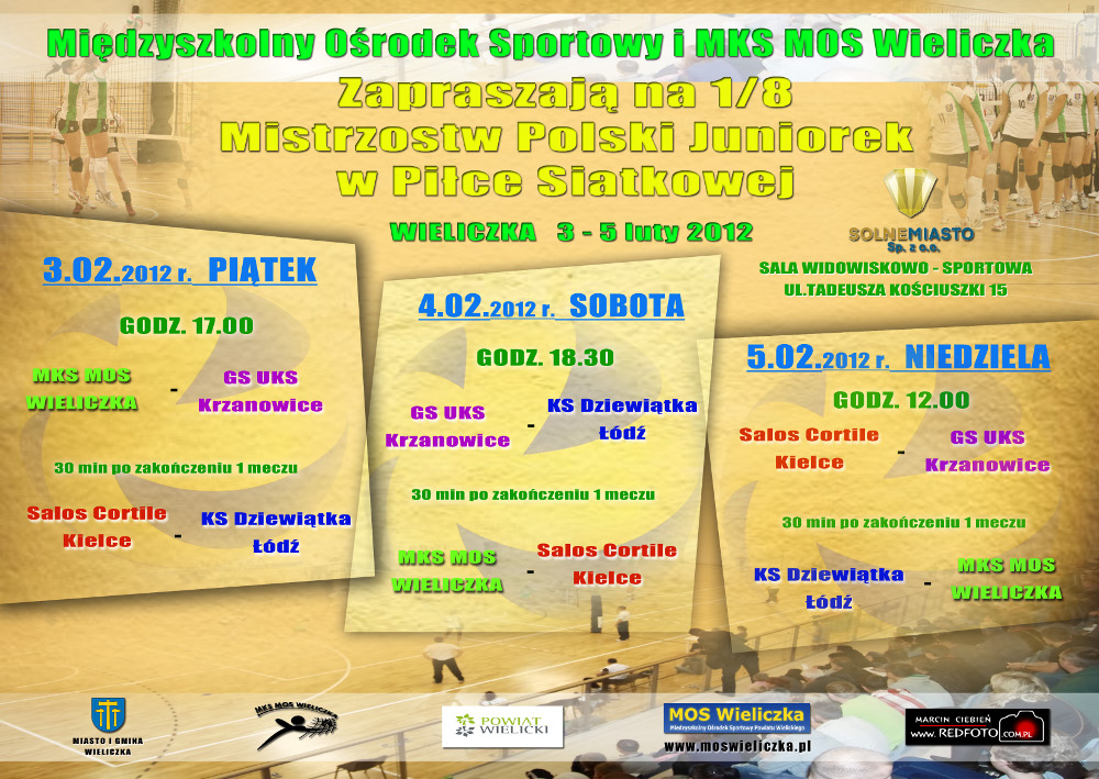 Międzyszkolny Ośrodek Sportowy i MKS MOS Wieliczka serdecznie zapraszają na 1/8 Mistrzostw Polski Juniorek w Piłce Siatkowej w Centrum Edukacyjno-Rekreacyjnym Solne Miasto w Wieliczce w dniach 3-5 lutego 2012 roku.