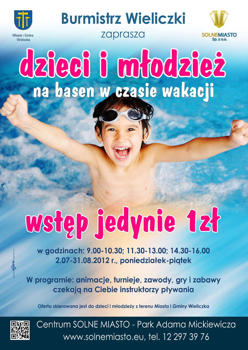 Serdecznie zapraszamy dzieci i młodzież na basen w czasie wakacji. Wstęp jedynie 1 zł w godzinach: 9.00 – 10.30, 11.30 -13.00 , 14.30 – 16.00. Oferta obowiązuje w dniach 2.07 – 31.08. 2012 r., poniedziałek – piątek.