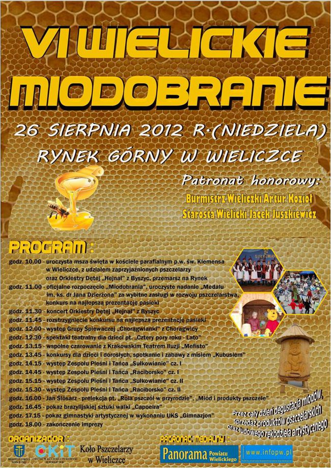 Mieszkańców Wieliczki oraz okolicznych miejscowości serdecznie zapraszamy na VI Wielickie Miodobranie, które odbędzie się 26 sierpnia 2012 r. (niedziela), Rynek Górny w Wieliczce. Patronat honorowy: Burmistrz Miasta i Gminy Wieliczka oraz Starosta Wielicki.