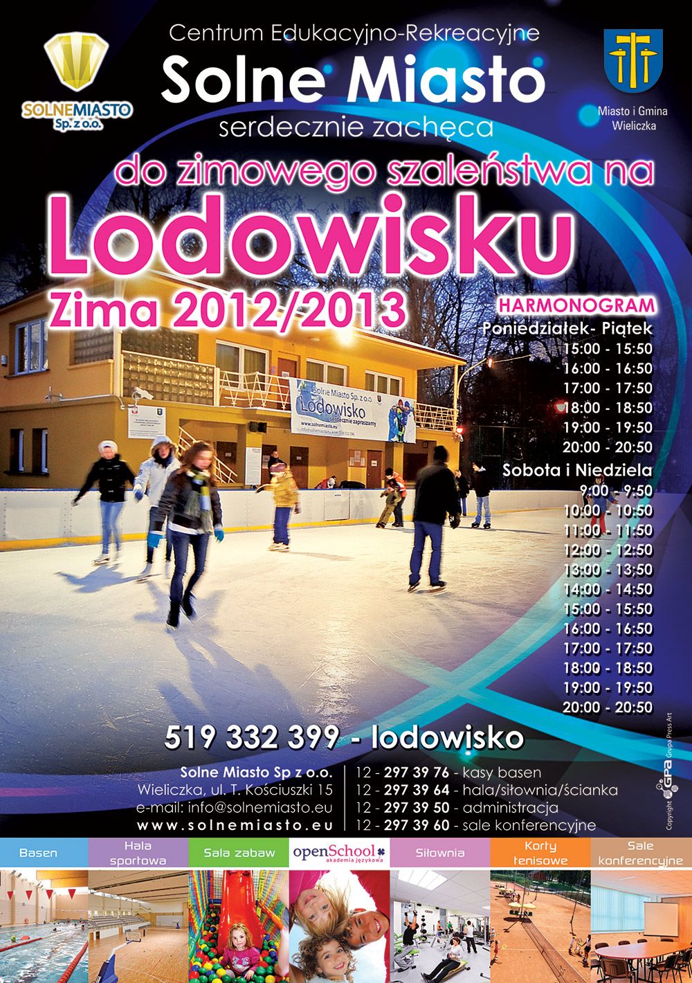 Centrum Edukacyjno – Rekreacyjne „Solne Miasto” zaprasza na zimowe szaleństwo na lodowisku, które otwarte jest już od 10 grudnia br. ! Lodowisko znajduje się w Parku Mickiewicza na terenie kompleksu sportowego, a konkretnie na kortach tenisowych. Wielickie lodowisko powstało w ramach pilotażowego projektu „Biały Orlik”. Jeśli ktoś nie posiada łyżew nie jest to żadną przeszkodą, ponieważ przy lodowisku znajduje się wypożyczalnia ! Należy tylko okazać dokument ze zdjęciem.