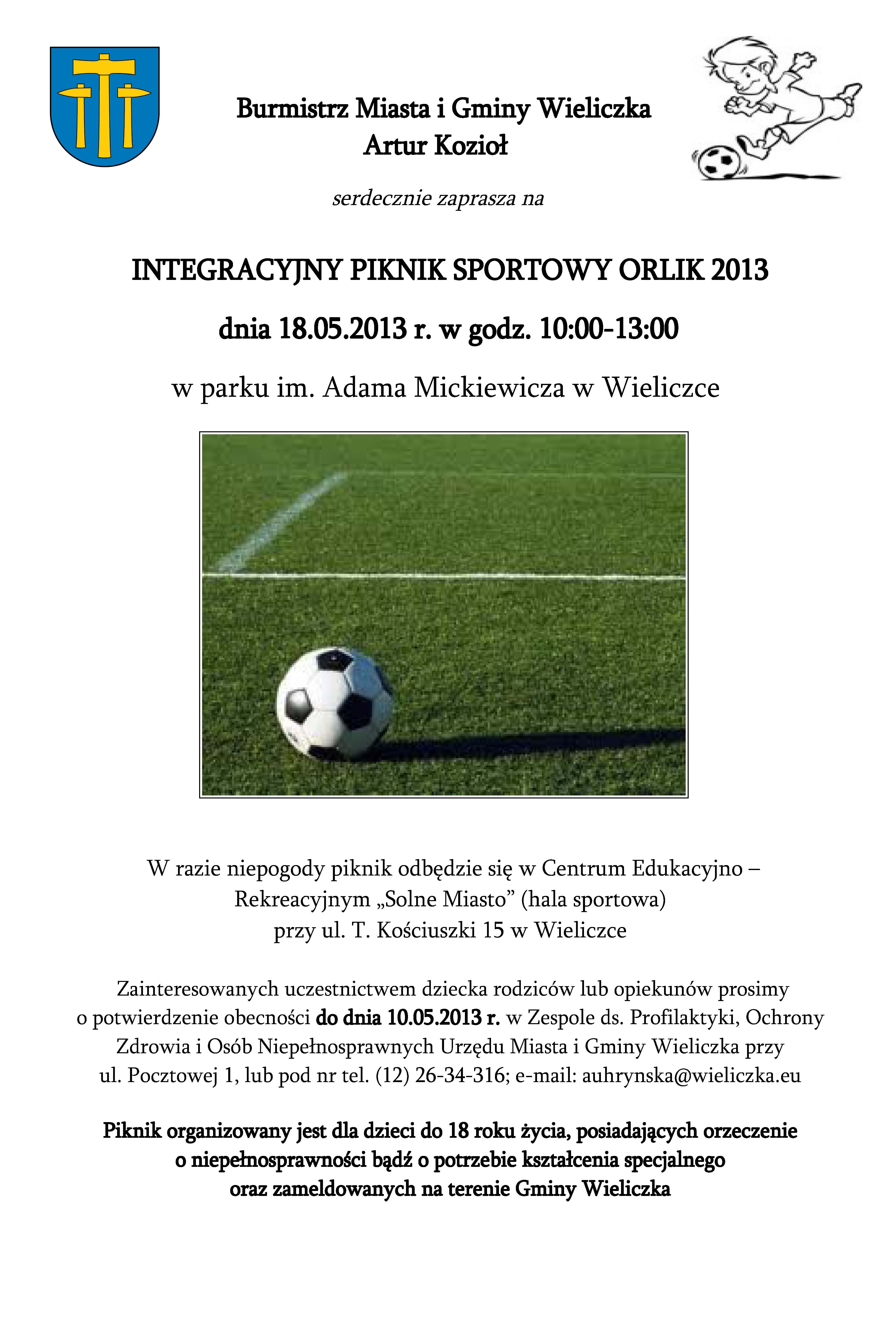 Burmistrz Miasta i Gminy Wieliczka Artur Kozioł serdecznie zaprasza na INTEGRACYJNY PIKNIK SPORTOWY ORLIK 2013 dnia 18.05.2013 r. w godz. 10:00-13:00 w parku im. Adama Mickiewicza w Wieliczce. W razie niepogody piknik odbędzie się w Centrum Edukacyjno – Rekreacyjnym „Solne Miasto” przy ul. T. Kościuszki 15 w Wieliczce (hala sportowa). Zainteresowanych uczestnictwem dziecka rodziców lub opiekunów prosimy o potwierdzenie obecności do dnia 13.05.2013 r. w Zespole ds. Profilaktyki, Ochrony Zdrowia i Osób Niepełnosprawnych Urzędu Miasta i Gminy w Wieliczce przy ul. Pocztowej 1, lub pod nr tel. (12) 26-34-316; e-mail: auhrynska@wieliczka.eu