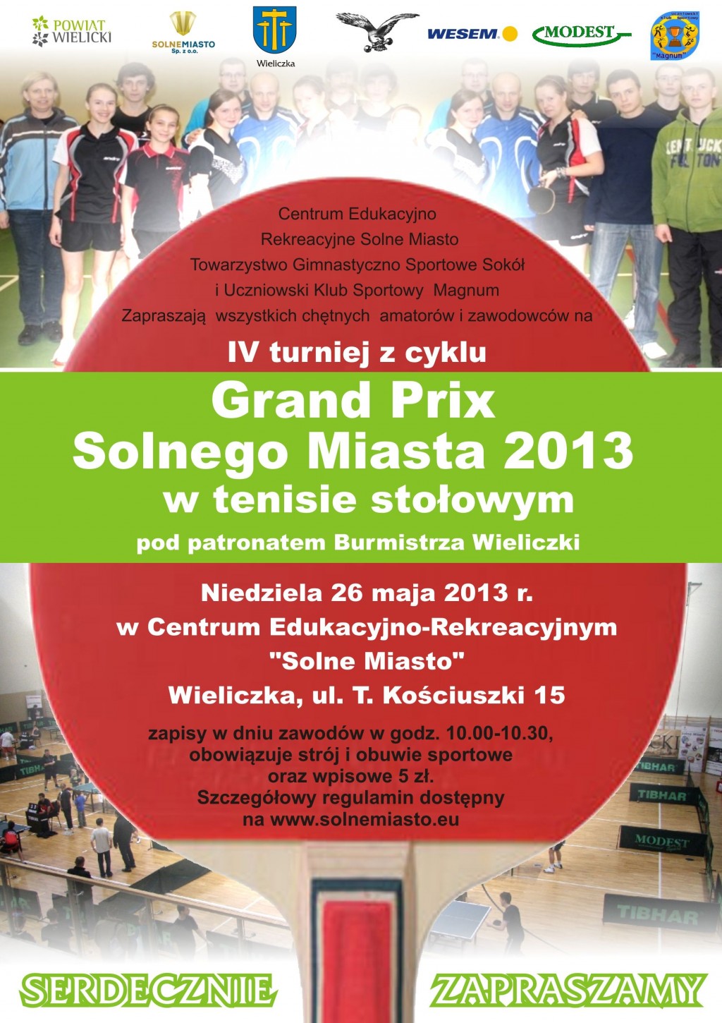 Centrum Edukacyjno - Rekreacyjne "Solne Miasto", Towarzystwo Gimnastyczno-Sportowe "Sokół" i Uczniowski Klub Sportowy "Magnum", zapraszają wszystkich chętnych amatorów i zawodników na IV turniej z cyklu Grand Prix Solnego Miasta 2013 w tenisie stołowym pod patronatem Burmistrza Wieliczki.