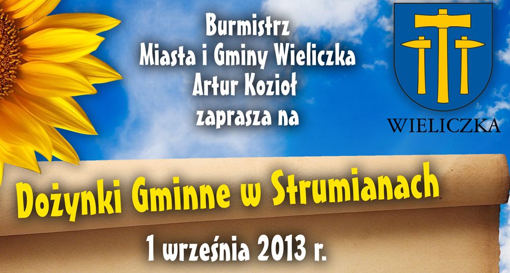 Burmistrz Miasta i Gminy Wieliczka, Rada Sołecka i Rada Parafialna w Strumianach oraz Lokalna Grupa Działania Wielicka Wieś zaprasza na Dożynki Gminne, które odbędą się 1 września br. w Strumianach.