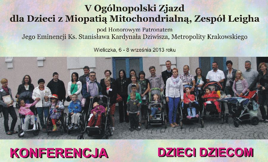 Serdecznie zapraszamy na V Ogólnopolski Zjazd dla dzieci z Miopatią i Mitochondrialną, Zespół Leigha, który odbędzie w dniach 6-8 września br. w Centrum Edukacyjno – Rekreacyjnym „Solne Miasto”. Jubileuszowy zjazd odbędzie się pod Honorowym Patronatem Jego Eminencji Ks. Stanisława Kardynała Dziwisza, Metropolity Krakowskiego.