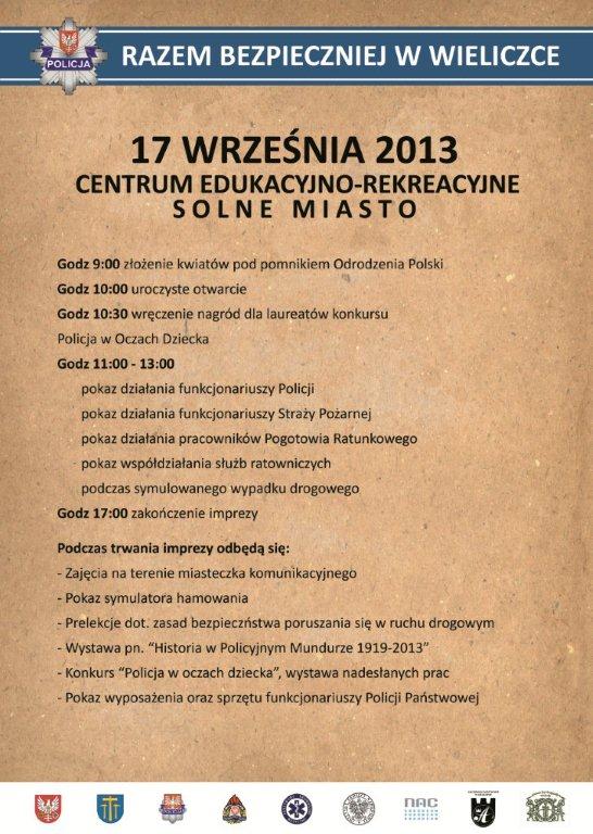 Akcja potrwa do godziny 17:00, a na wszystkich zebranych czeka mnóstwo atrakcji, między innymi zajęcia na terenie miasteczka komunikacyjnego, pokaz symulatora hamowania, prelekcje dotyczące zasad bezpieczeństwa podczas poruszania się w ruchu drogowym, wystawa o tytule „Historia w Policyjnym Mundurze 1919-2013”, wystawa prac biorących udział w konkursie „Policja w oczach dziecka”, a także pokaz wyposażenia oraz sprzętu funkcjonariuszy Policji Państwowej.