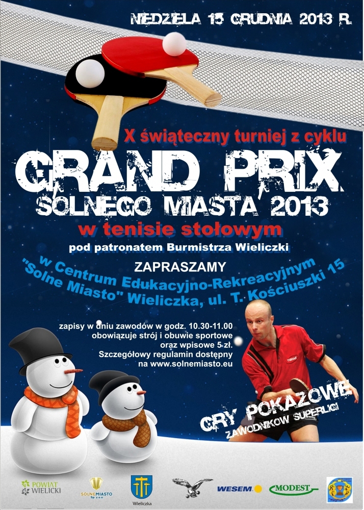 Zapraszamy na X Świąteczny turniej z cyklu Grand Prix Solnego Miasta 2013 w tenisie stołowym, który odbędzie się 15 grudnia w niedzielę, w Centrum Edukacyjno-Rekreacyjnym „Solne Miasto” Wieliczka, ul. T.Kościuszki 15.
